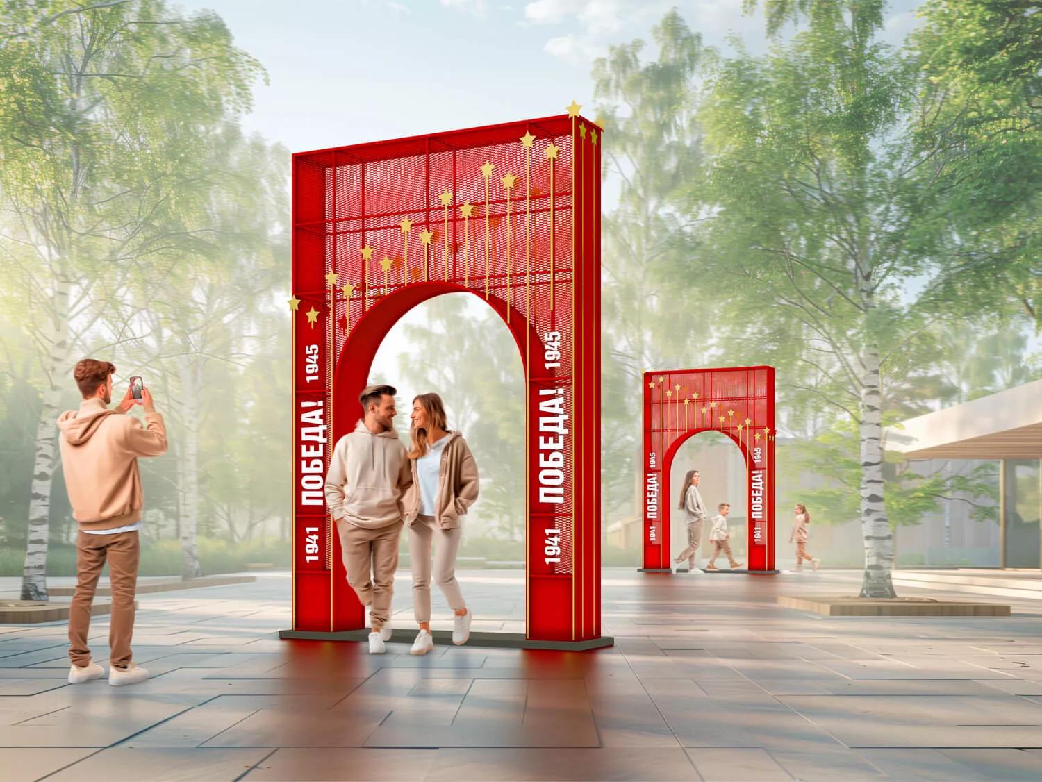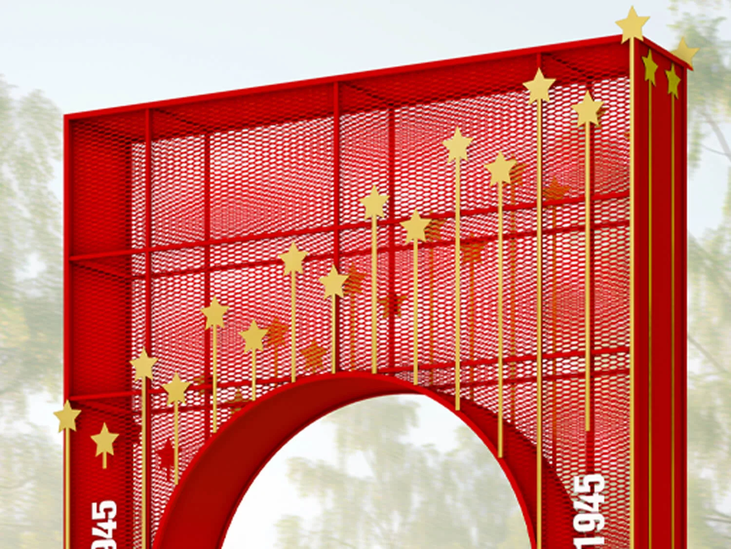 Металлические арки, украшенные золотыми звездами, станут удачным вариантом праздничного оформления небольшой улицы или аллеи. Установив сразу несколько арок, можно создать эффектный тоннель.