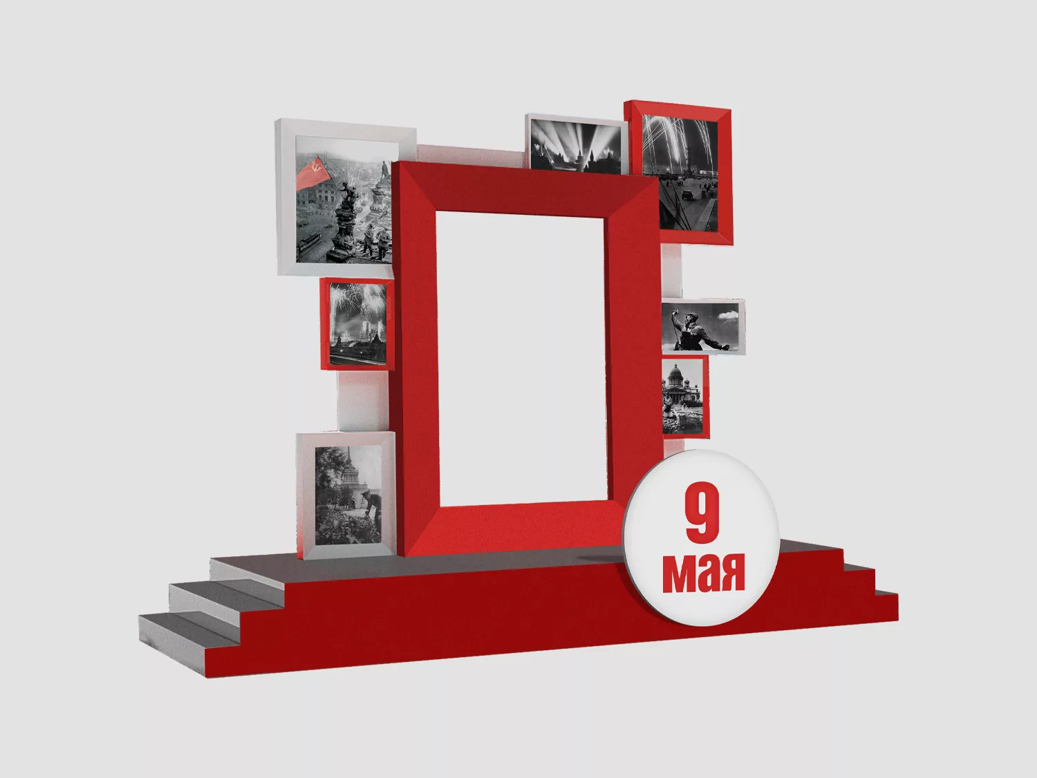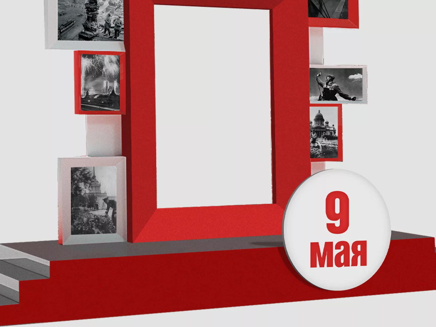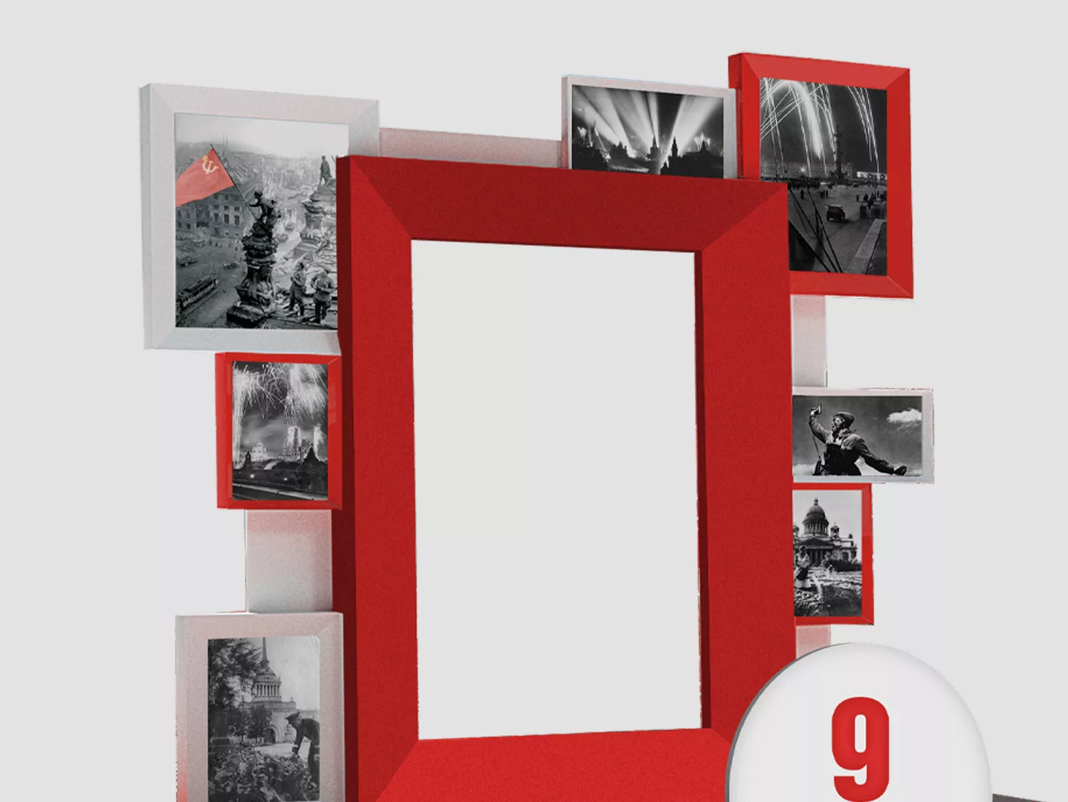 Фотозона, украшенная кадрами военного времени. Конструкция может быть установлена на популярных локациях и станет главной праздничной фотозоной: жители города могут делиться снимками в социальных сетях, что позволит увеличить популярность локации и напомнить о важной для каждого дате.