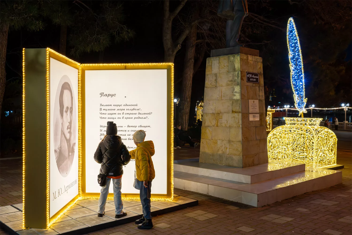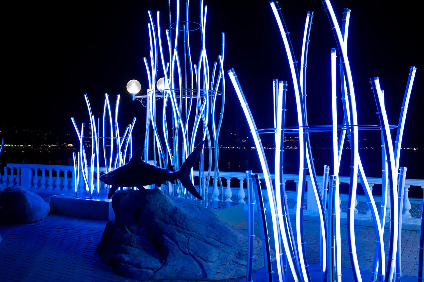 Отдельные арт-объекты формируют точки притяжения: световые скульптуры, фотозоны, композиции с колоннами и фигурами, вписанные в существующую архитектуру и зеленые массивы. Проект не перегружает пространство, а аккуратно сопровождает прогулку, делая городскую среду более нарядной и живой. В результате набережная становится местом встреч, неспешных прогулок и вечерних фотографий — узнаваемым, праздничным и по-настоящему курортным.