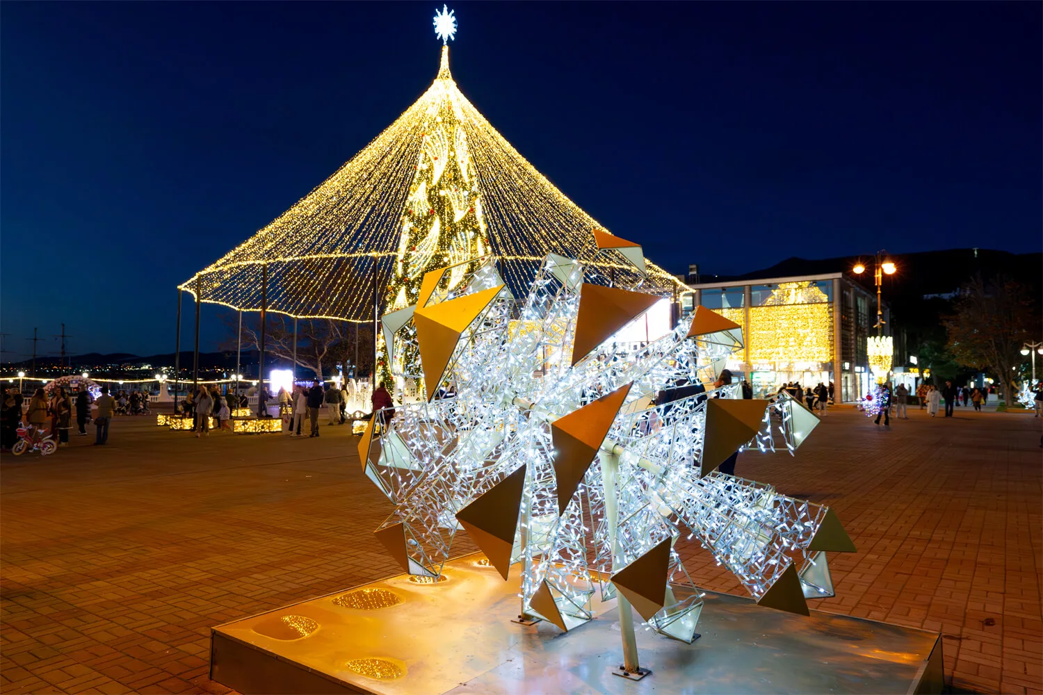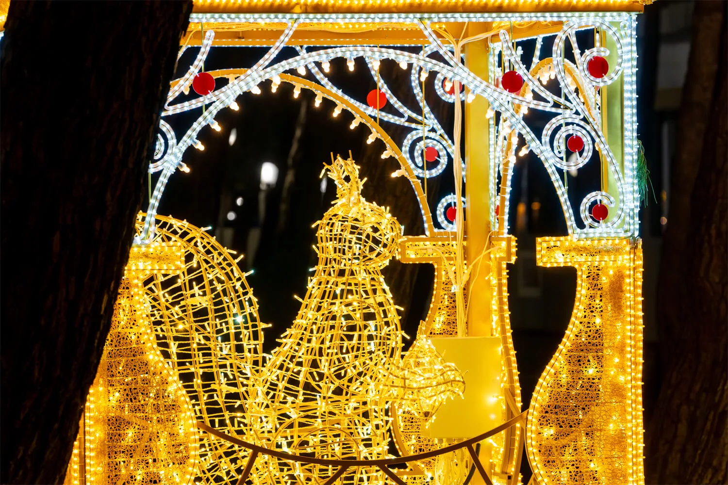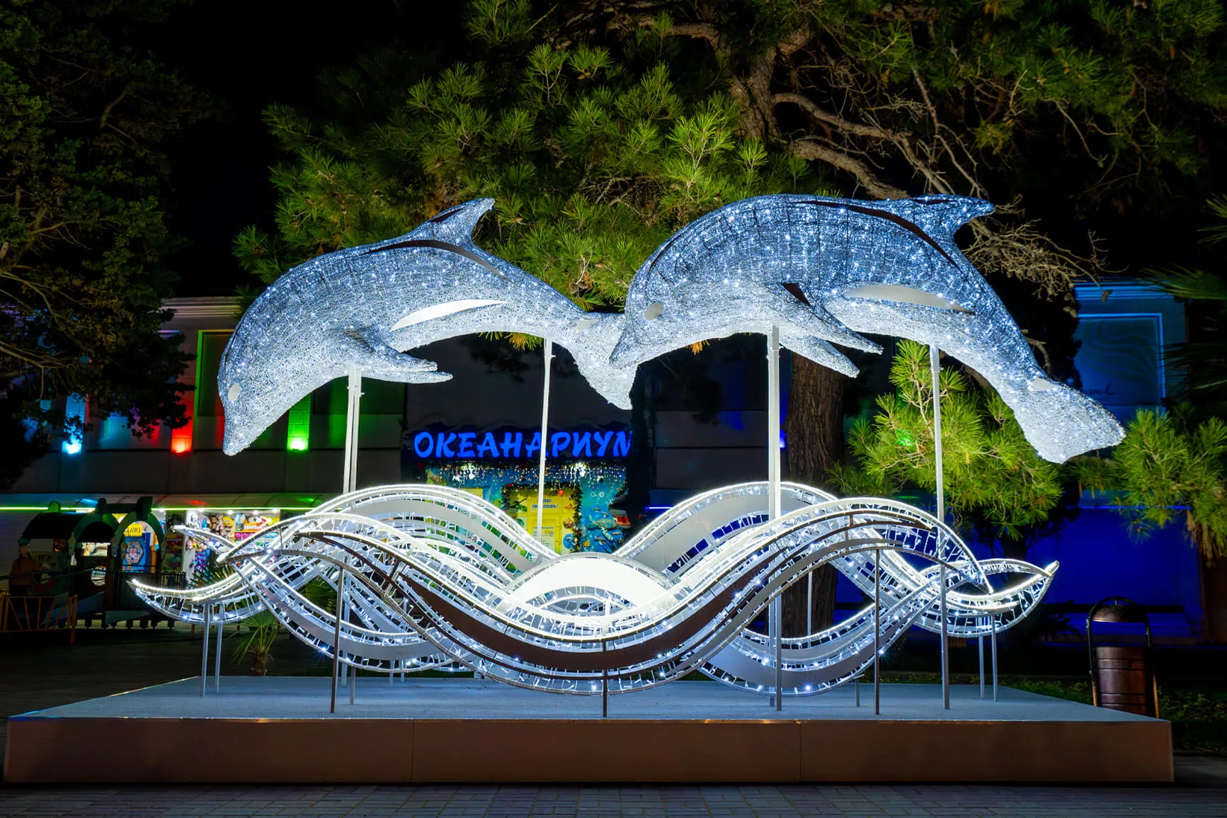Набережная Геленджика на время праздников превратилась в световой маршрут, где морская тема стала главным настроением. Светящиеся водоросли и арки, мягко выстроенные вдоль прогулочных аллей, создают эффект подводного мира, а фигуры дельфинов словно выходят из темноты навстречу зрителям. Теплое золотое и холодное голубое свечение работает как единая сцена, подчёркивая близость моря, простор и вечернюю курортную атмосферу.
