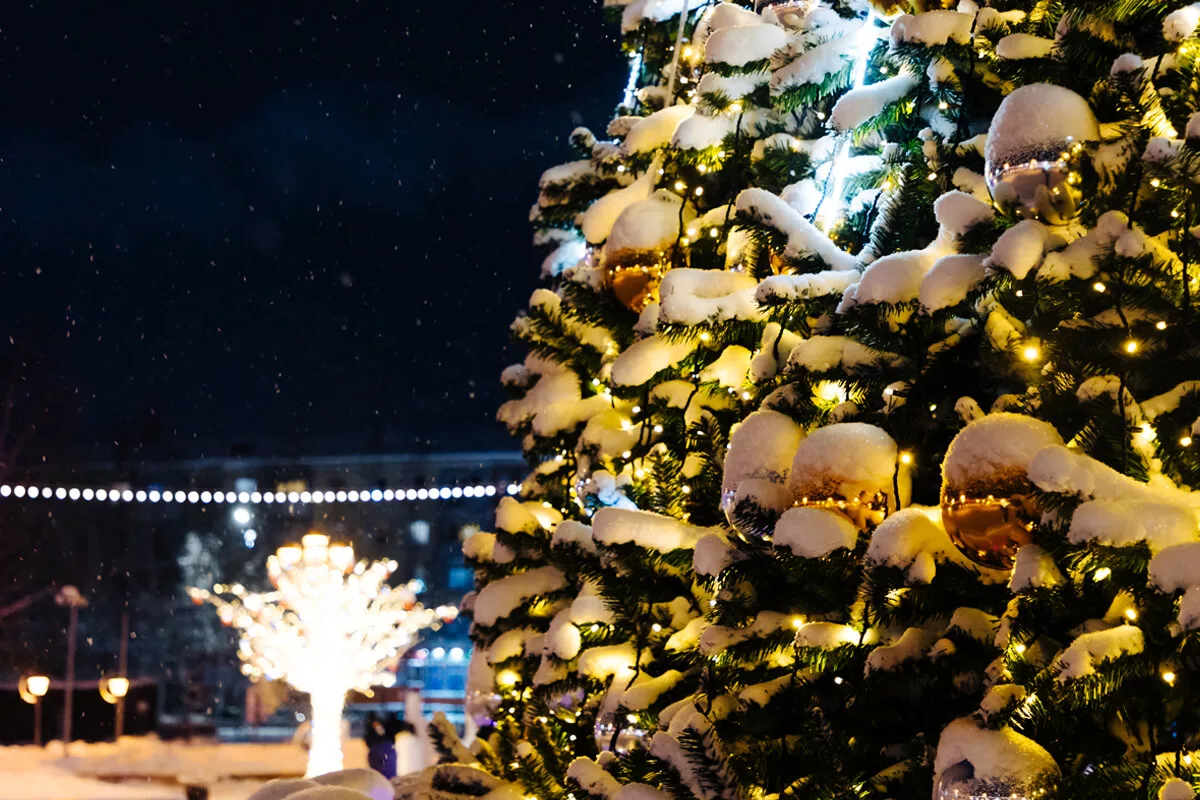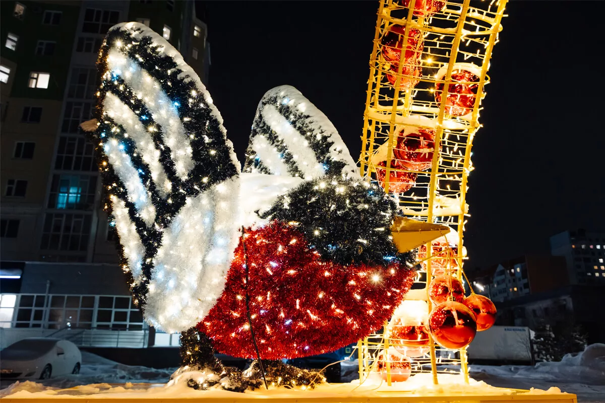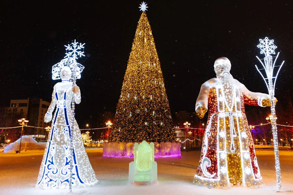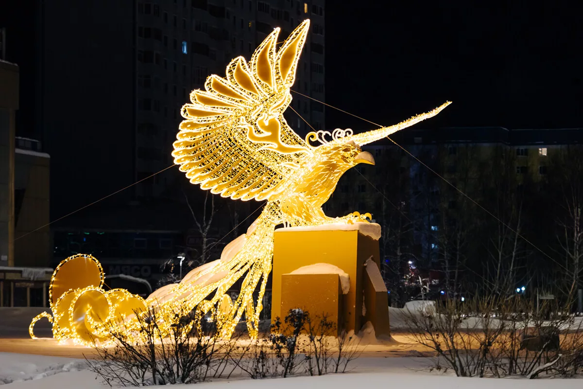 Новогоднее оформление Нижневартовска построено как последовательность световых сцен, каждая из которых раскрывается по мере движения по пространству. В центре композиции — высокая ель с плотным золотым свечением и холодной звездой на вершине. Ее свет отражается от снега, усиливая ощущение масштаба и делая площадь визуальным ядром всей праздничной среды.