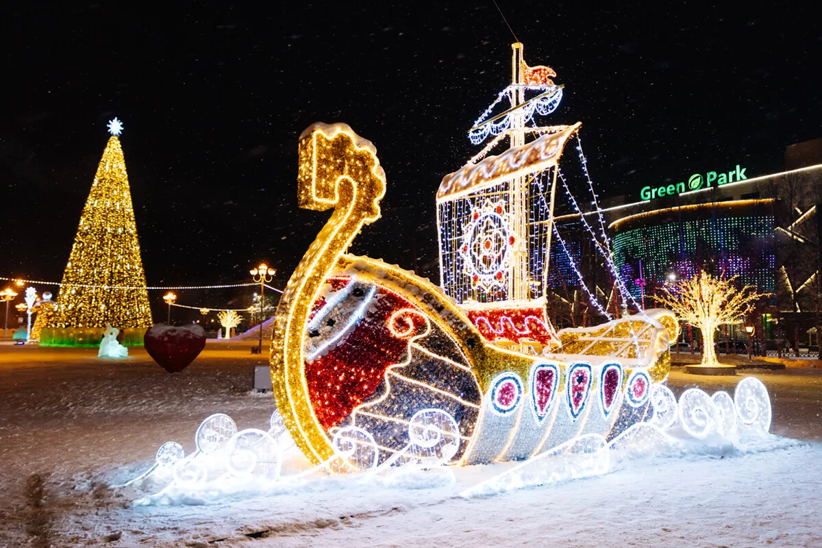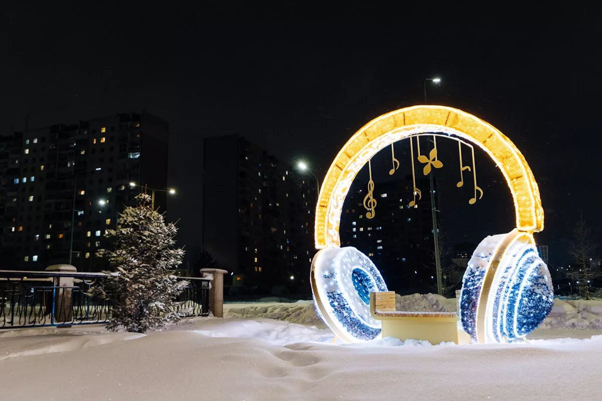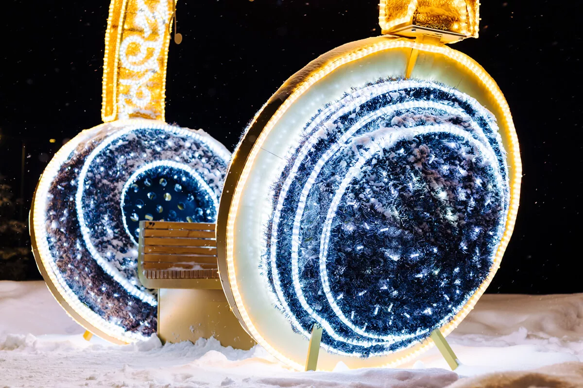 Отдельные инсталляции работают как точки притяжения: через них можно пройти, рядом можно остановиться или присесть. Свет здесь не просто декоративный — он формирует среду, в которой хочется задержаться. Общая палитра построена на сочетании теплого золота и холодного бело-синего света, что подчёркивает северный характер города и делает оформление цельным и собранным.