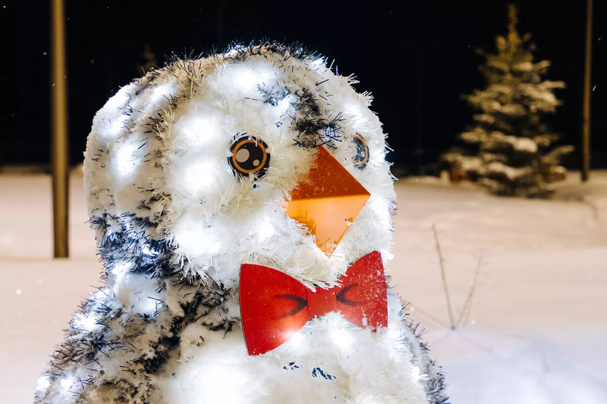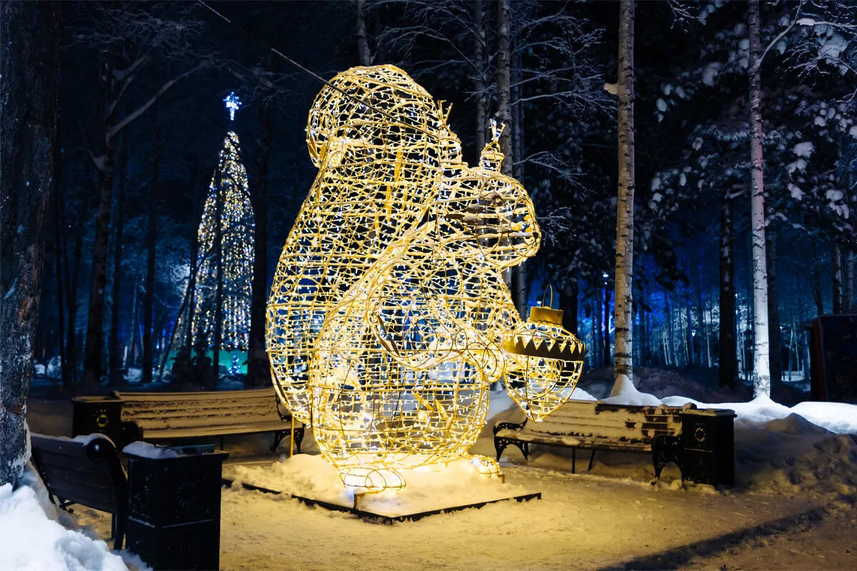 Вокруг формируется насыщенный, но выверенный ансамбль инсталляций. Световые деревья с подвесными шарами создают ритм вдоль прогулочных маршрутов, добавляя глубину и перспективу. Белые и золотые оттенки света подчеркивают зимнюю фактуру, а контраст с тёмным небом делает композиции особенно выразительными.
