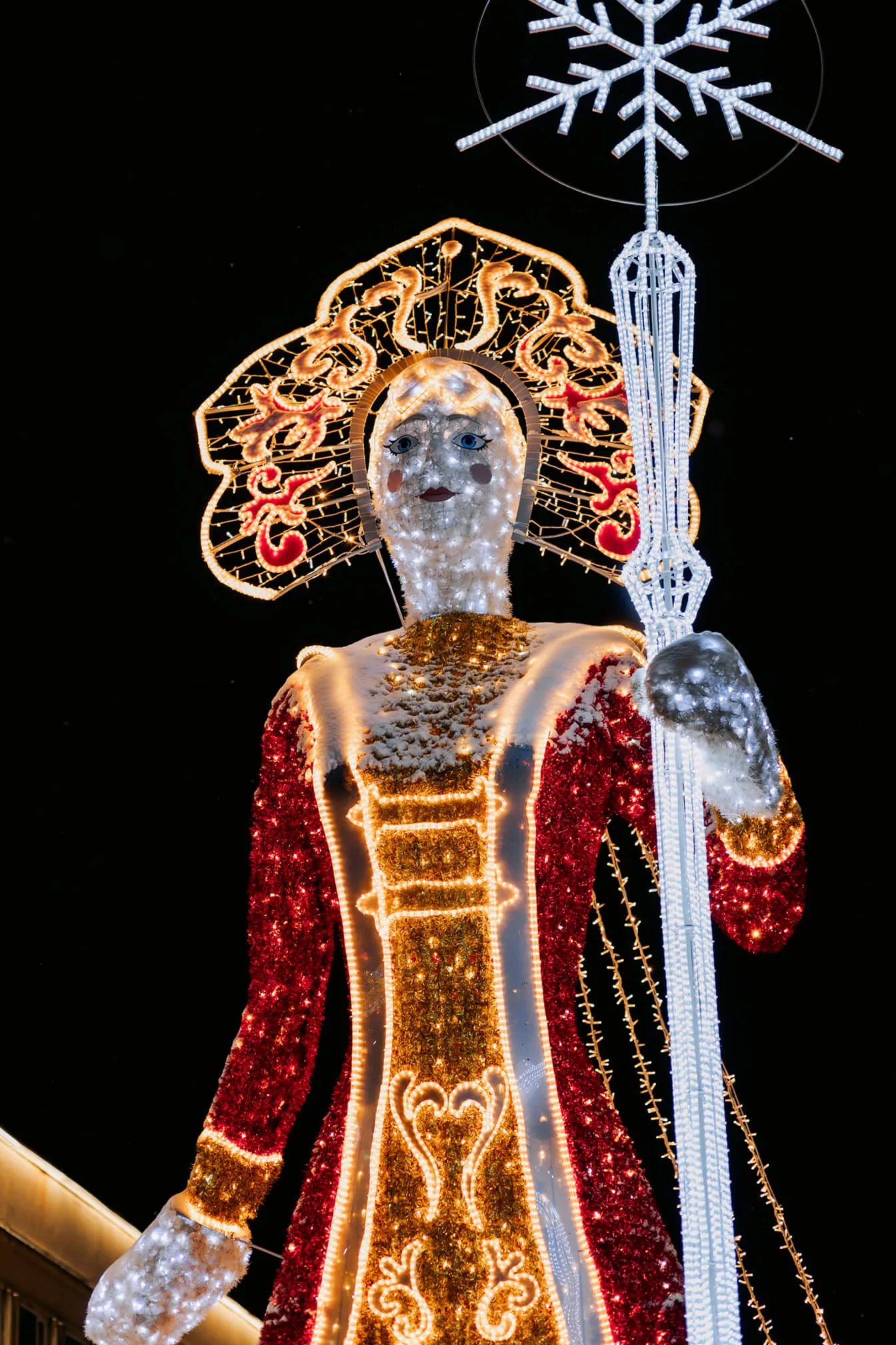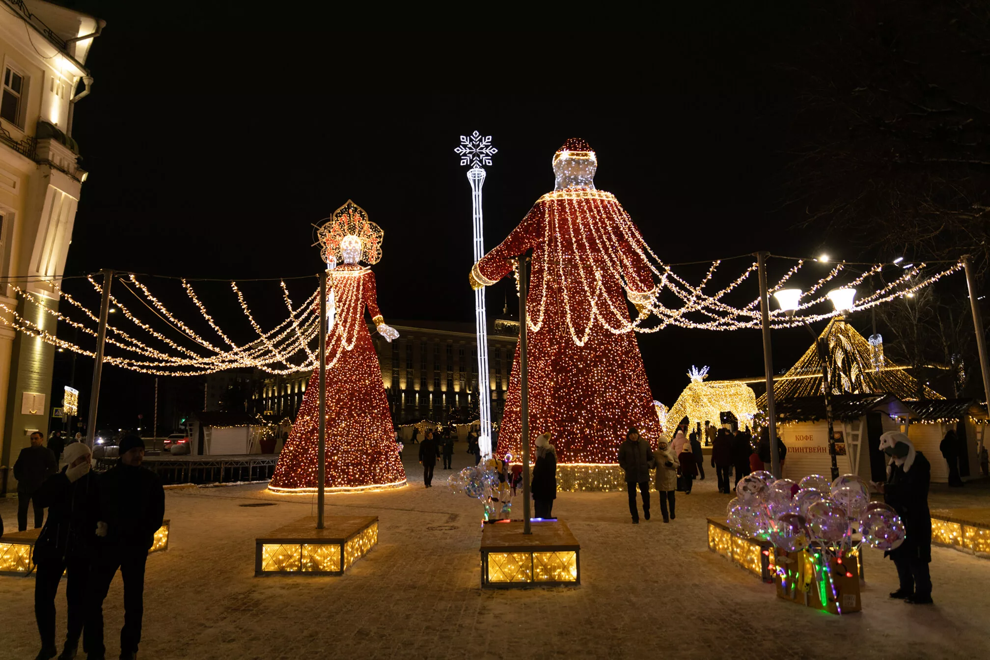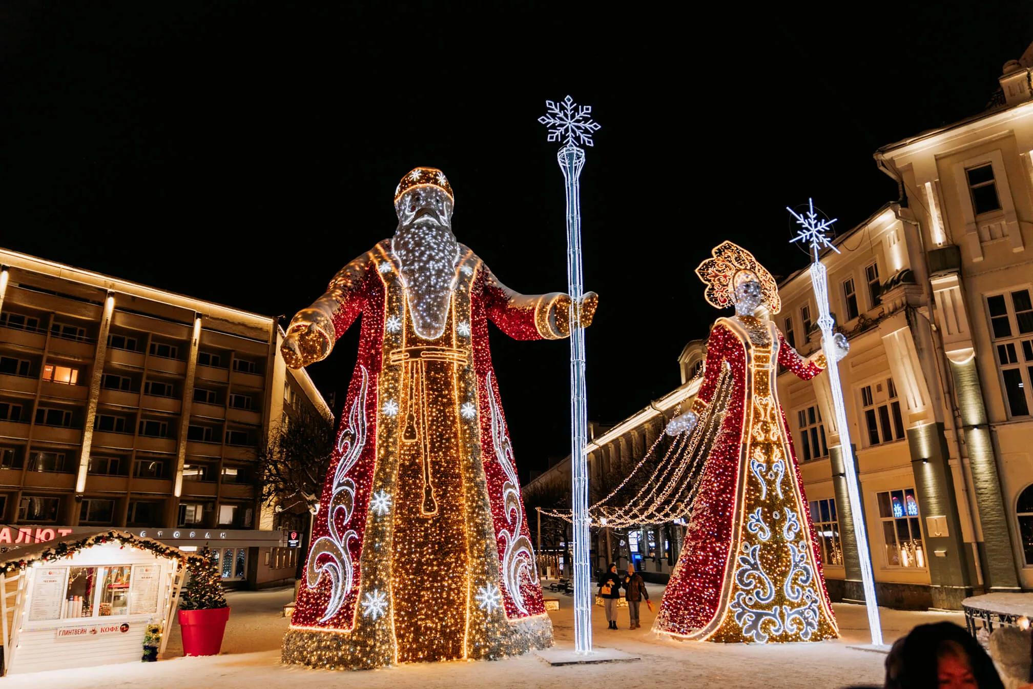 Новогоднее пространство в Орле выстроено как цельная световая сцена. Центральным акцентом стали масштабные фигуры Деда Мороза и Снегурочки — высокие, вытянутые силуэты в красно-золотой палитре, с проработанным орнаментом, снежинками и световыми узорами на одежде. Посохи со светящимися снежинками формируют вертикальные доминанты и визуально собирают пространство.