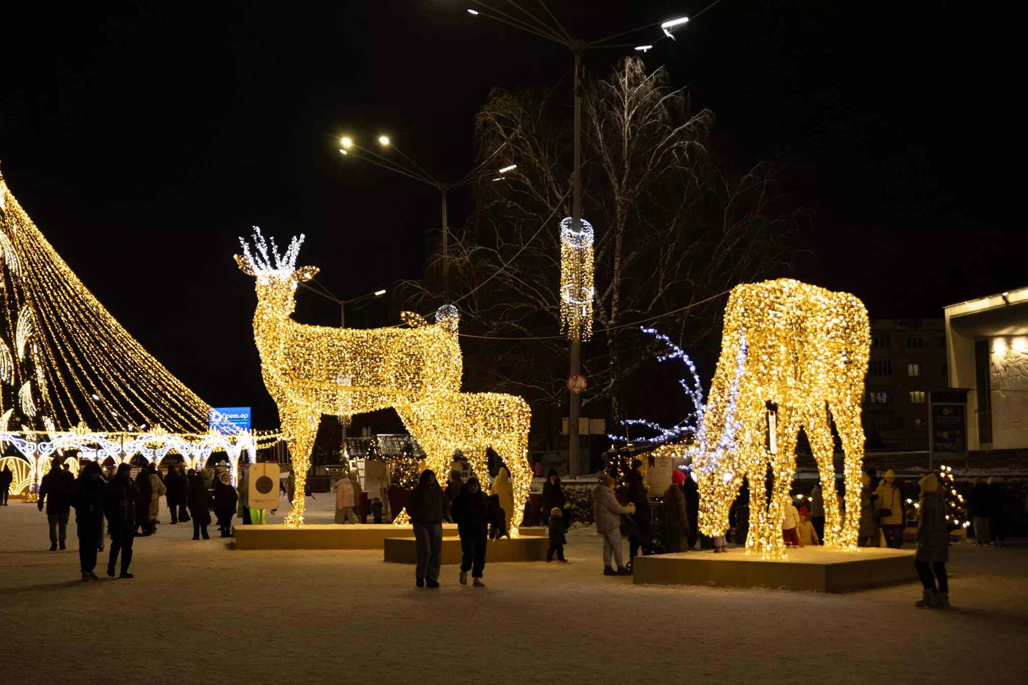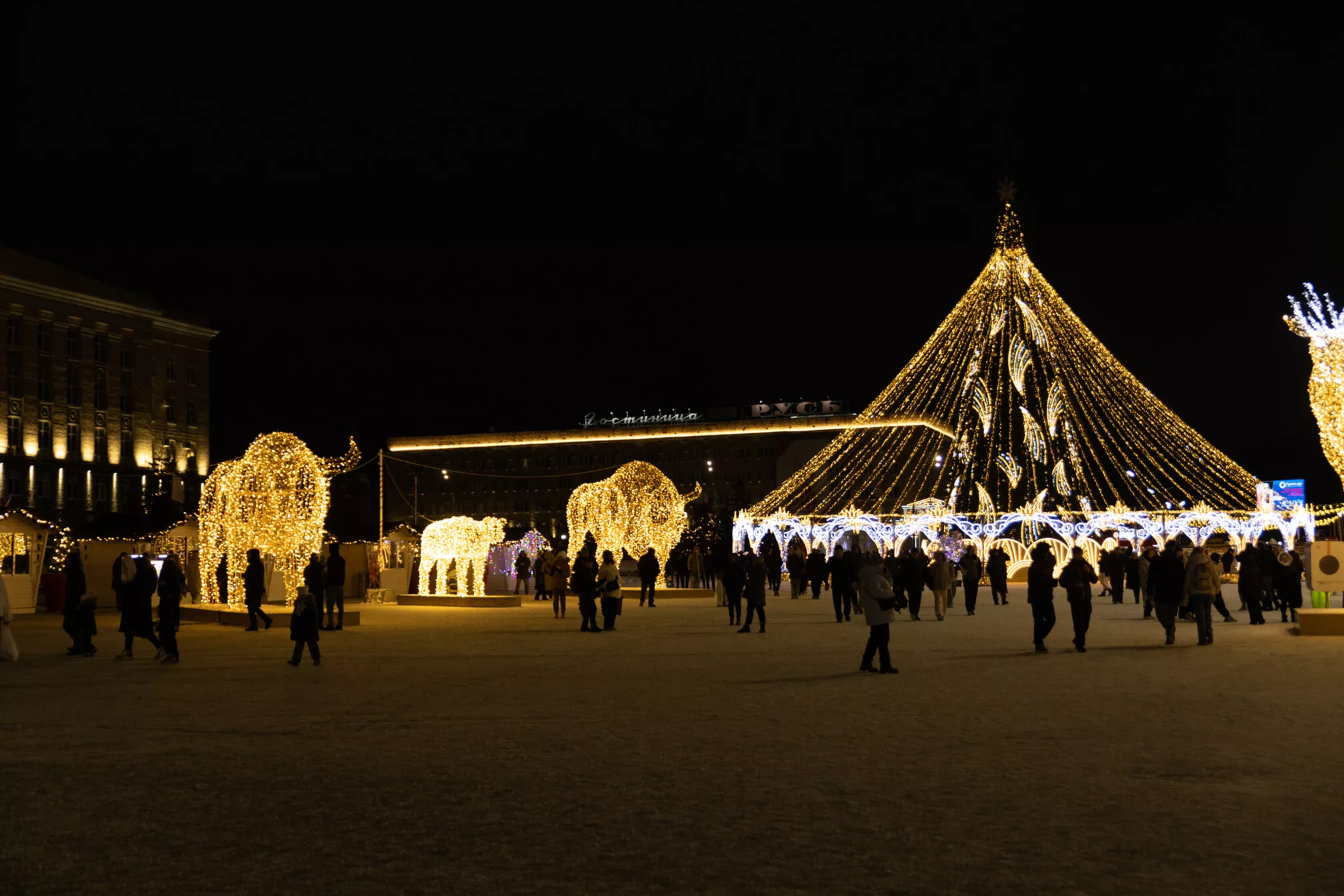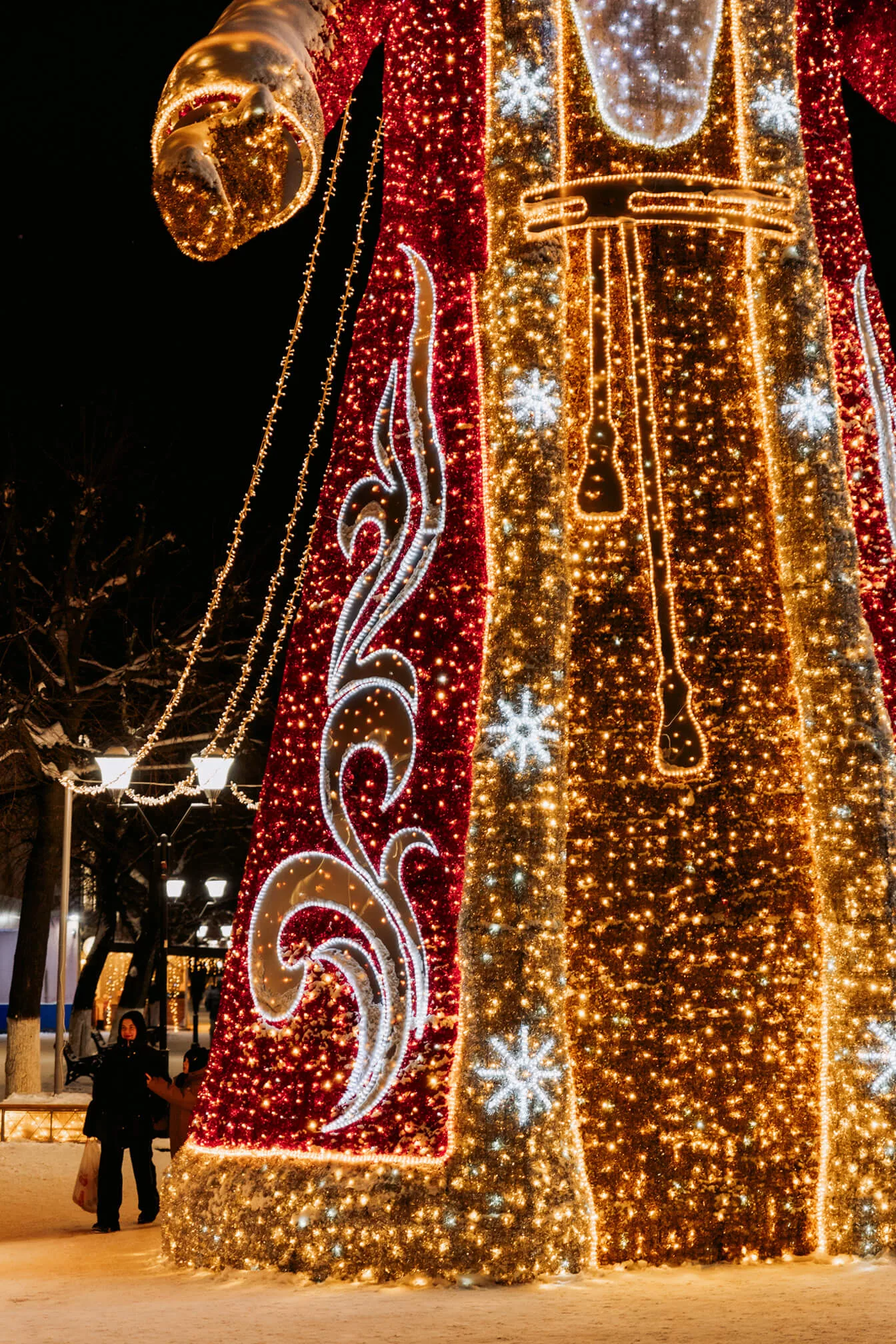 Вокруг — протяженные гирлянды, образующие световой «полог», и теплая золотая подсветка, которая объединяет фигуры, торговые домики и пешеходные маршруты в единую композицию. Свет распределен мягко, без резких контрастов, благодаря чему пространство читается цельно и камерно даже при большом масштабе. Инсталляция работает как точка притяжения: люди свободно перемещаются между объектами, останавливаются, фотографируются, остаются внутри сцены.