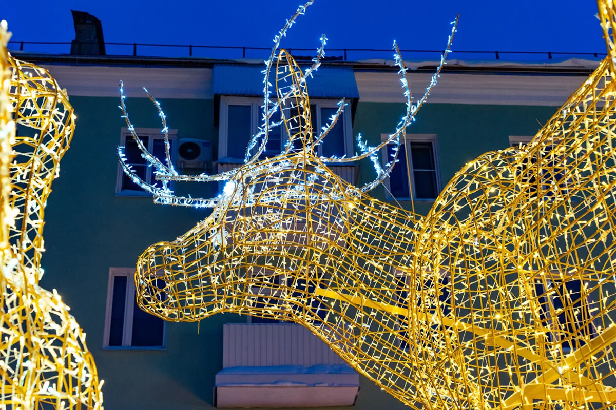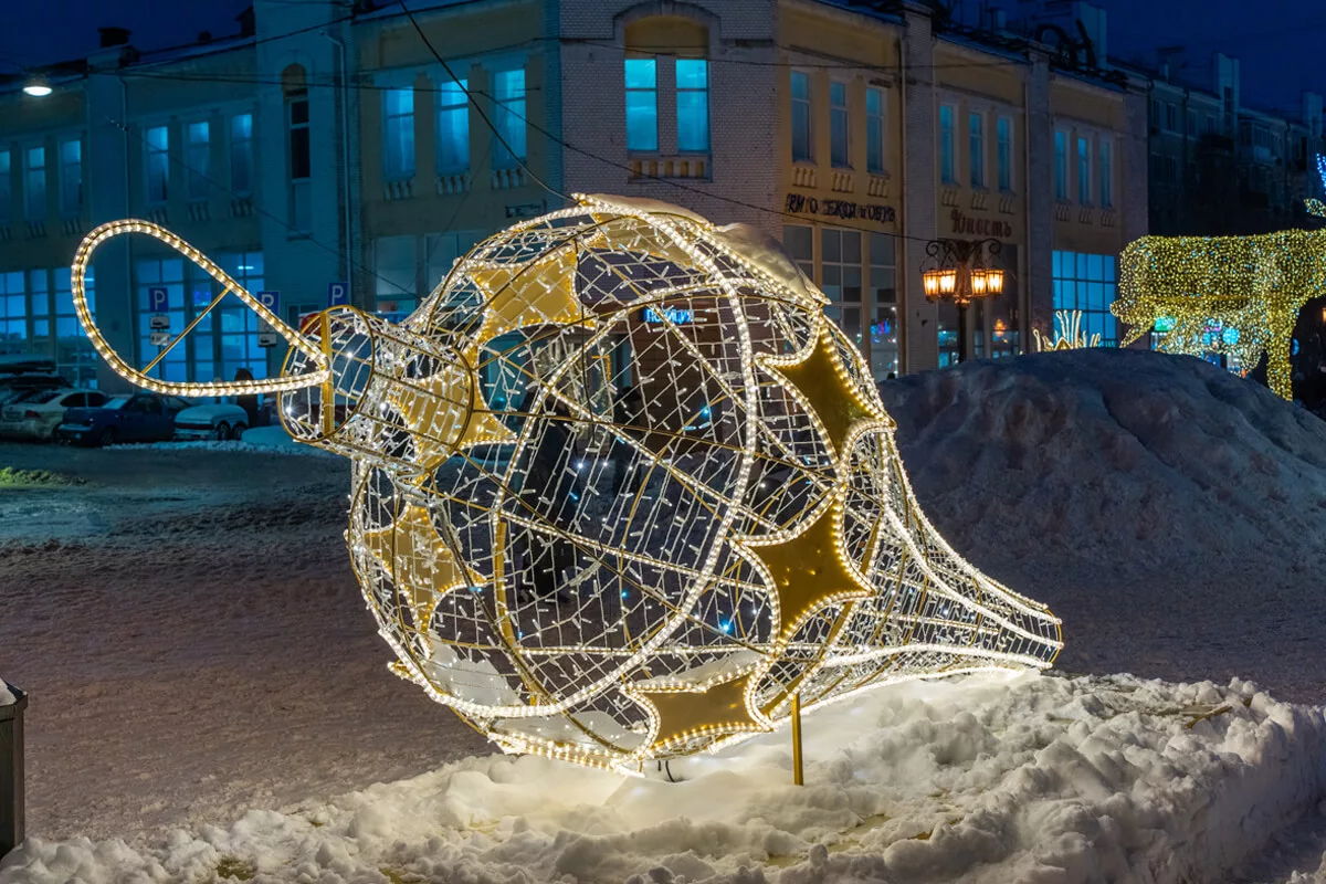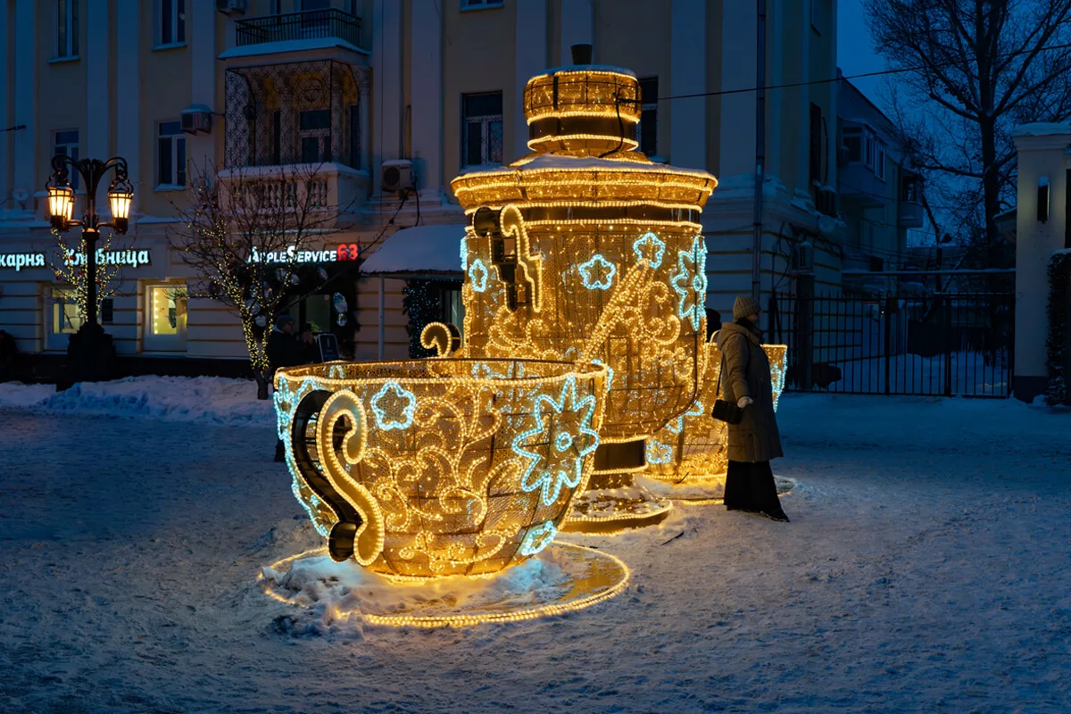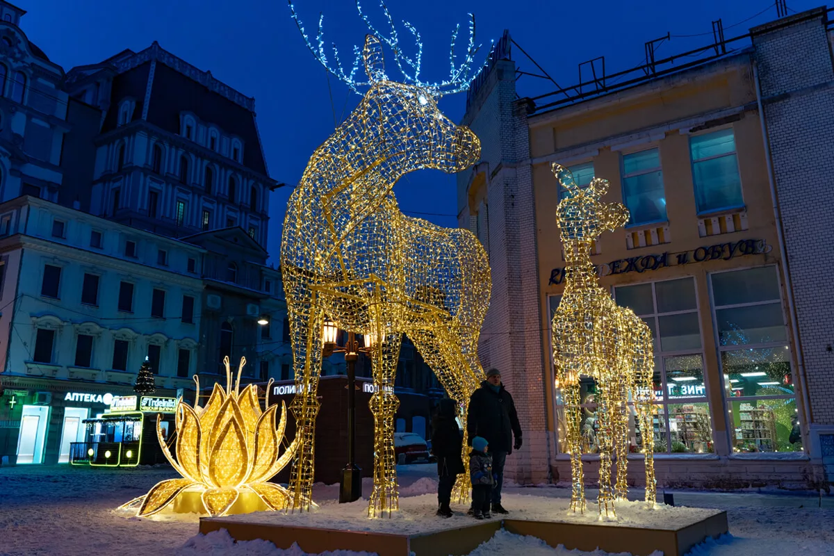 Световое оформление Самары выстроено как цельный вечерний маршрут, в котором каждая улица и площадь становится частью единой композиции. В пространстве появляются крупные световые объекты — арки с ажурным орнаментом, масштабные фигуры животных, сияющие цветы, декоративные шары и тематические инсталляции, собранные из металлического каркаса и плотной сетки гирлянд.