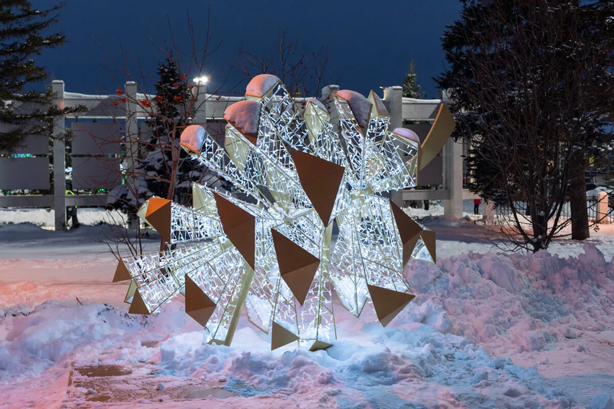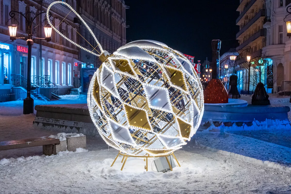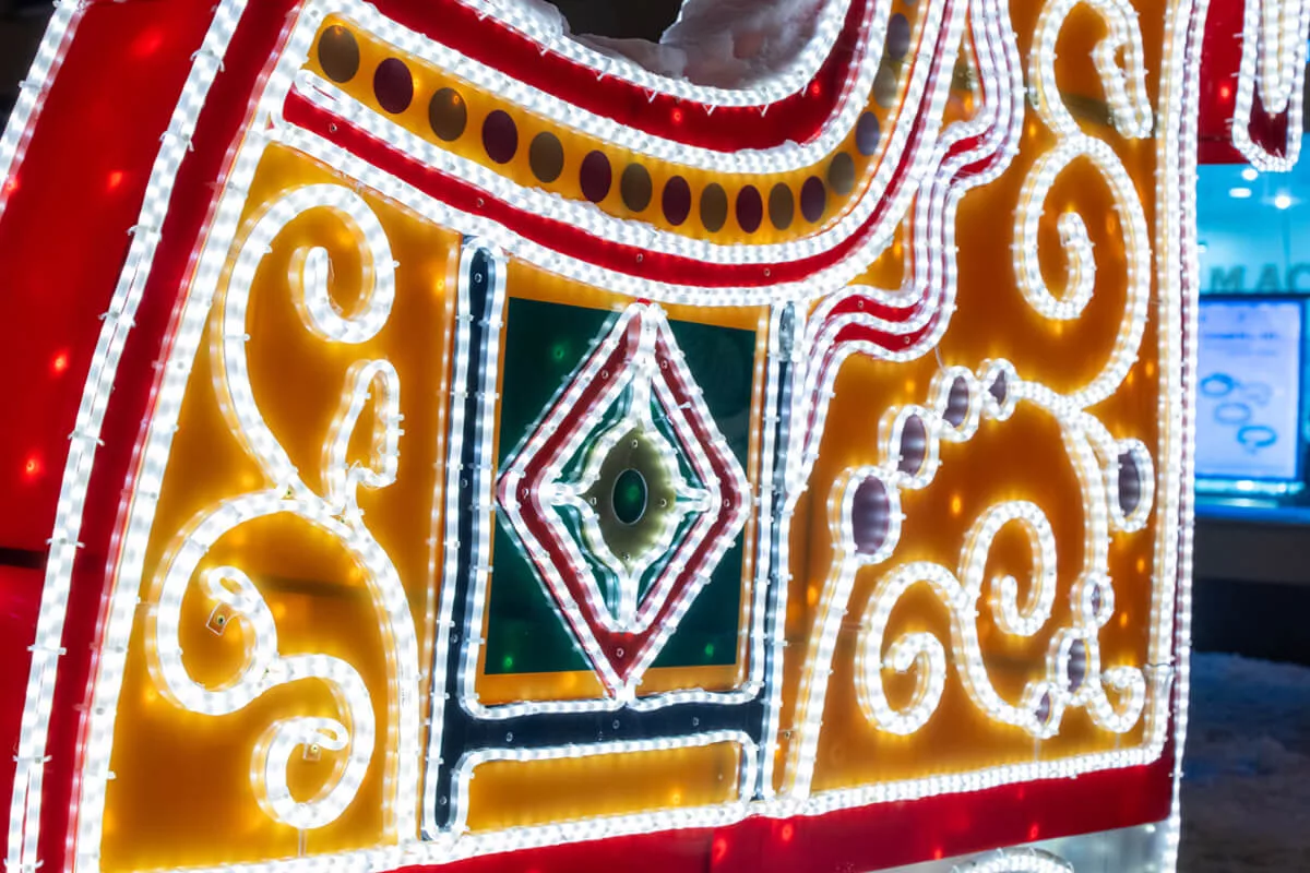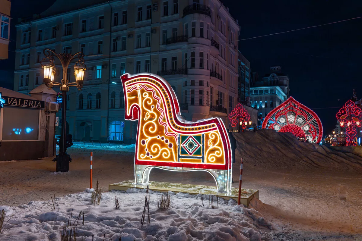 Световое оформление Самары выстроено как цельный вечерний маршрут, в котором каждая улица и площадь становится частью единой композиции. В пространстве появляются крупные световые объекты — арки с ажурным орнаментом, масштабные фигуры животных, сияющие цветы, декоративные шары и тематические инсталляции, собранные из металлического каркаса и плотной сетки гирлянд.