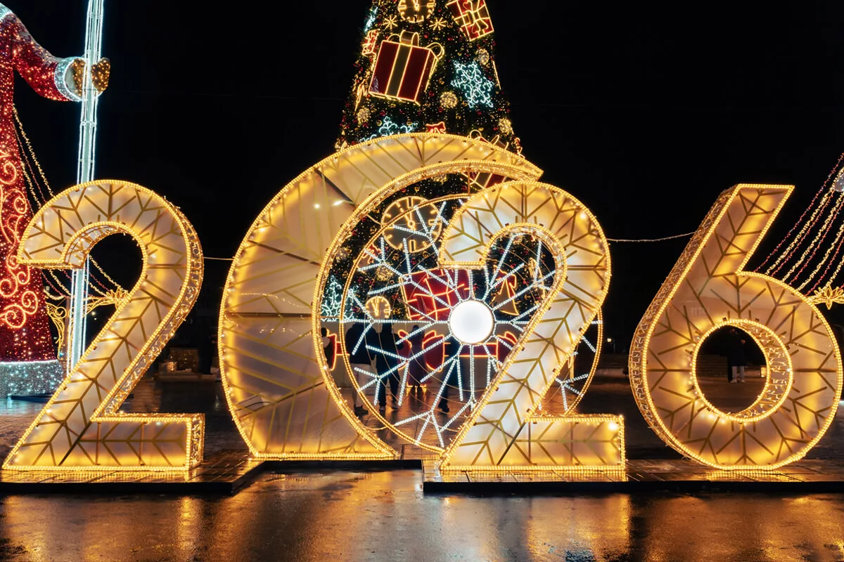 Центральная елка становится вертикальной доминантой, собранной из символов времени: часы, подарки, снежинки, световые акценты. Рядом — крупноформатные цифры года, фотозоны и световые порталы, которые работают не как декор, а как точки взаимодействия с городом.