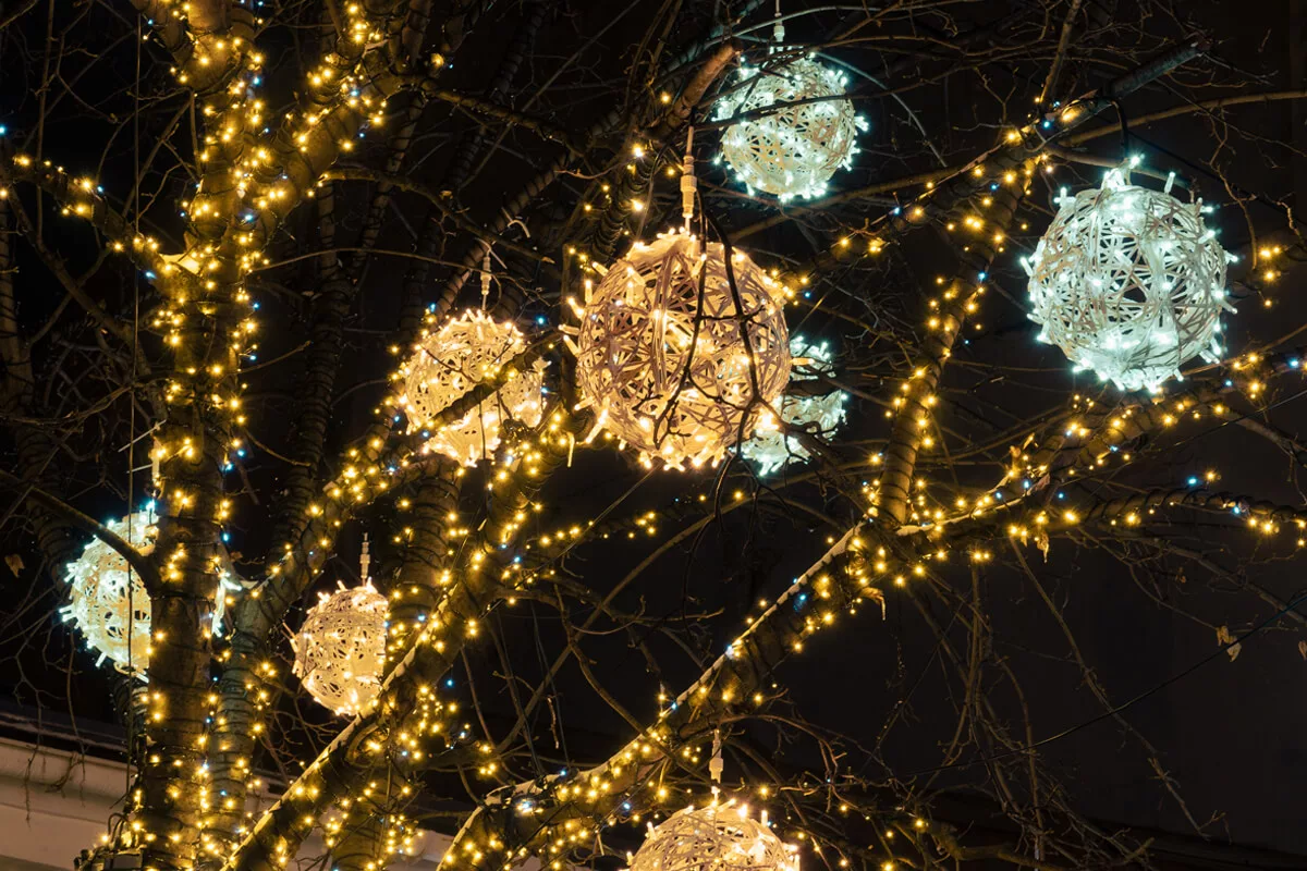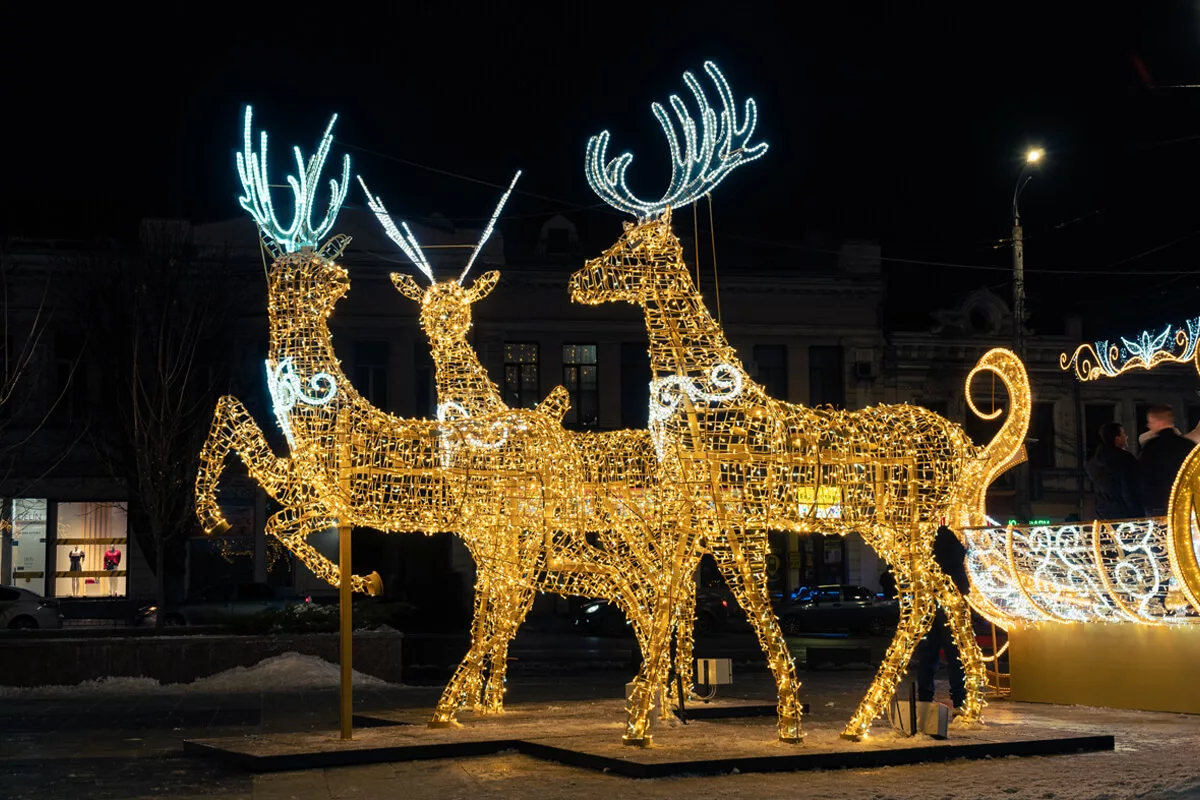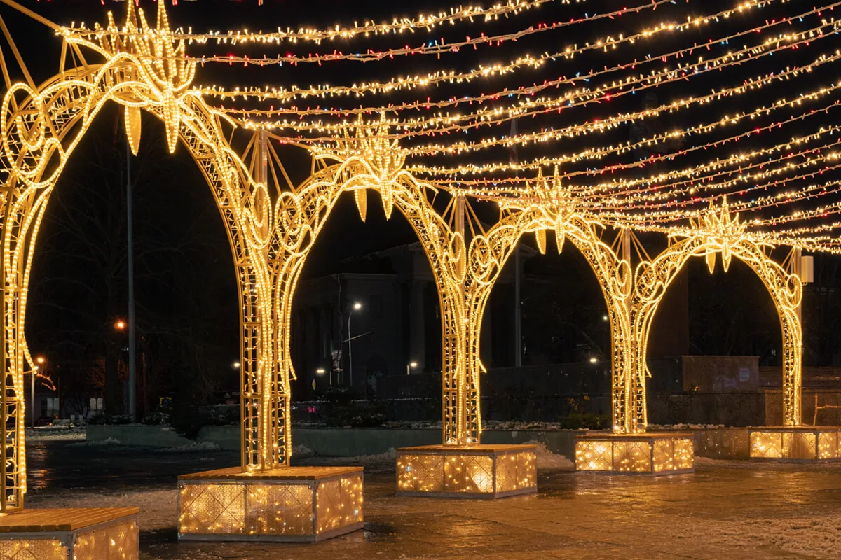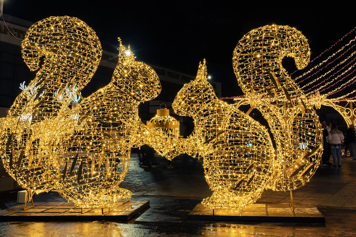 Арочные конструкции формируют ритм движения и задают торжественный вход в городскую прогулку. Над улицами — световые растяжки и орнаменты, которые работают как потолок из света, создавая ощущение камерности даже в открытых пространствах. Скульптурные фигуры — олени, белки, сказочные персонажи — добавляют пластичность и живое присутствие, превращая площадь в место притяжения для разных поколений.