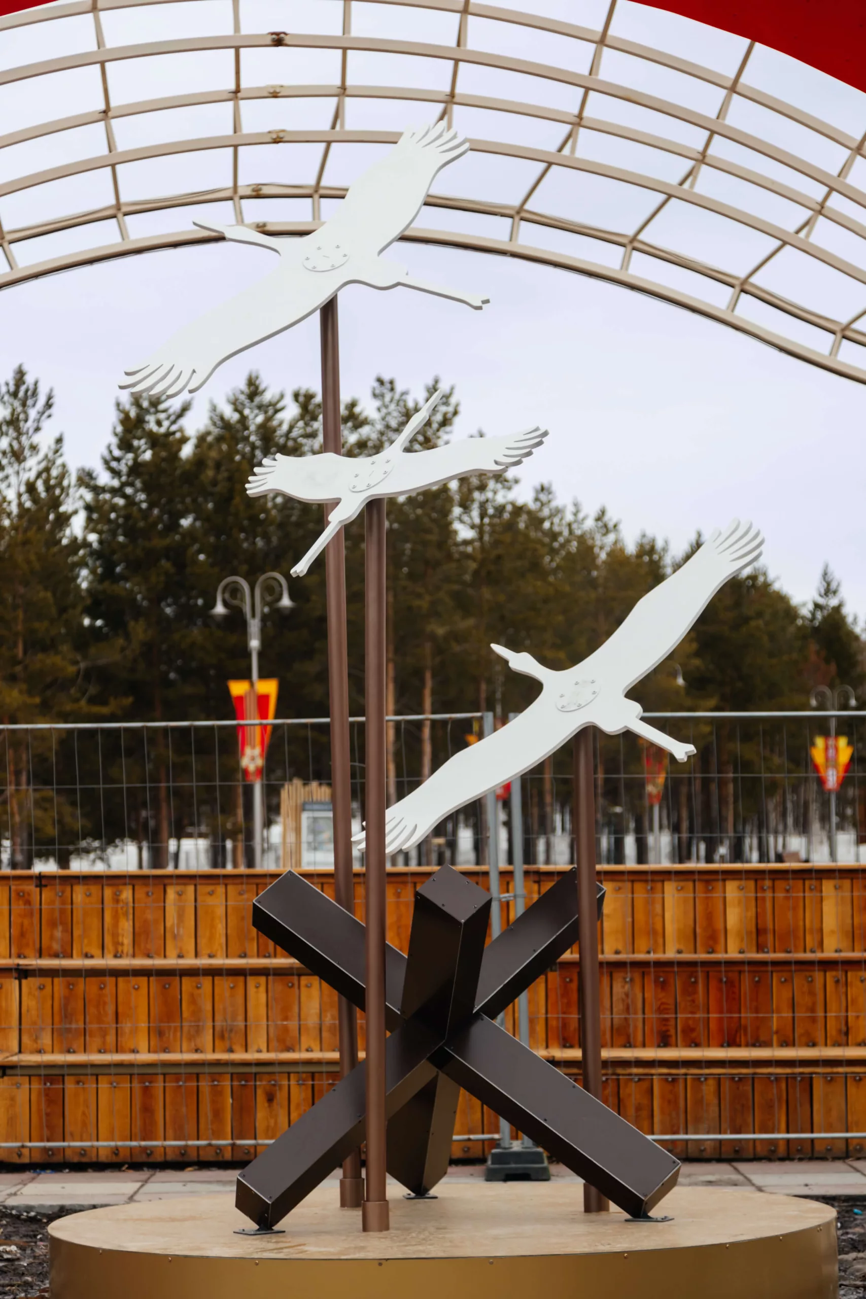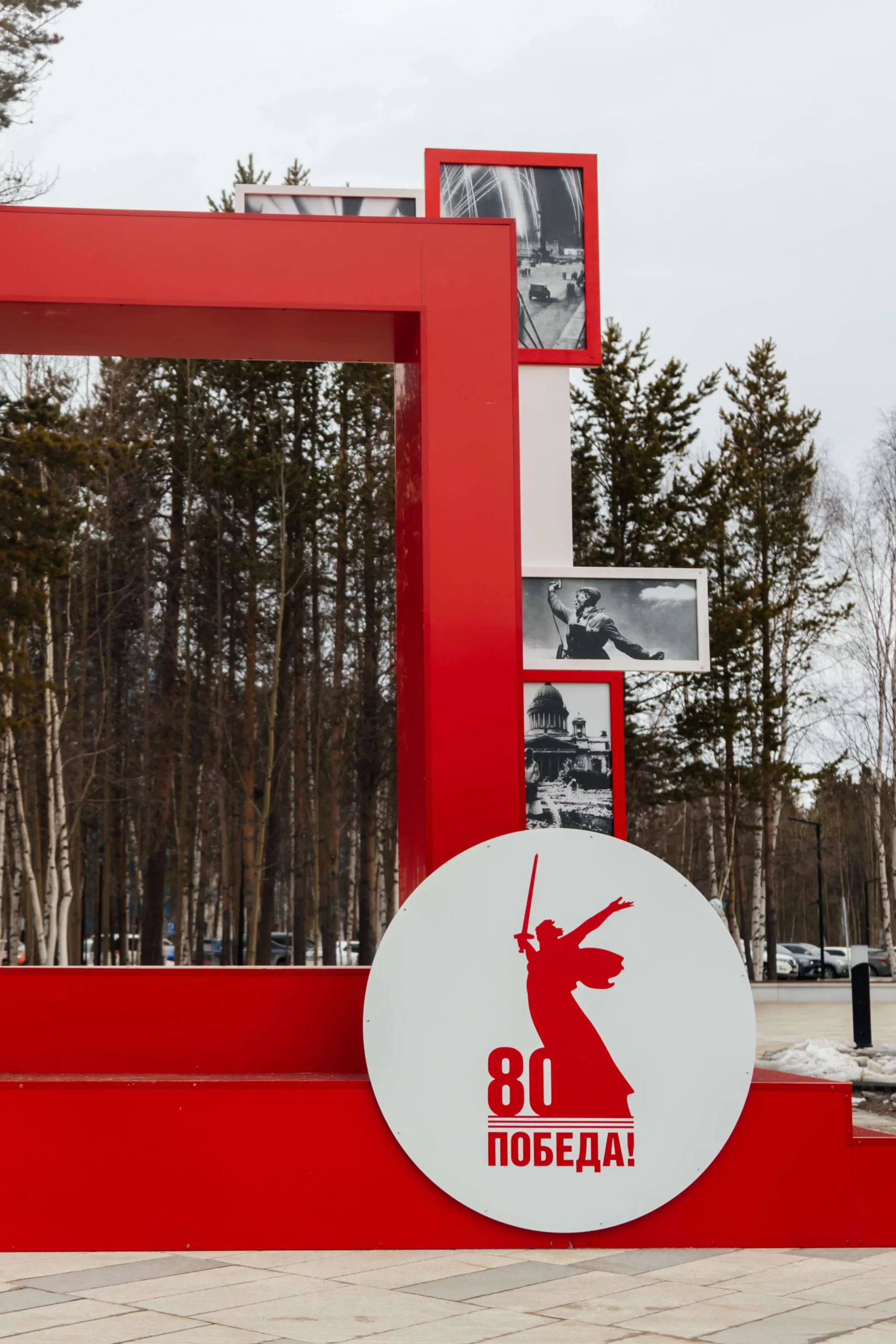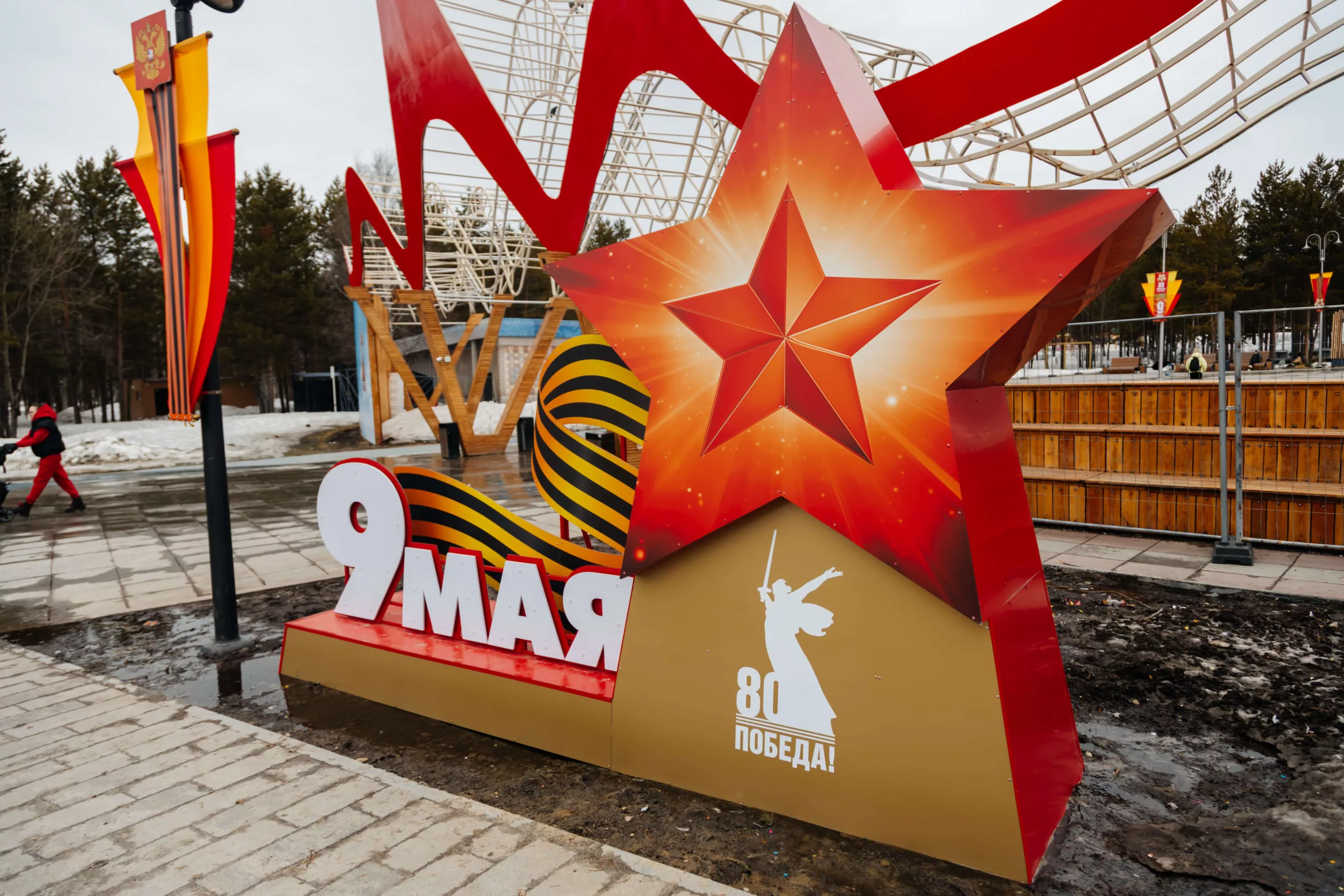 Центральными акцентами стали монументальные инсталляции с силуэтами солдат, летящих журавлей, знаковыми образами Победы и фотохроникой, встроенной в архитектуру объектов. Красно-золотая палитра, динамичные формы и световые акценты усиливают эмоциональное восприятие и делают оформление заметным как днем, так и в вечернее время.